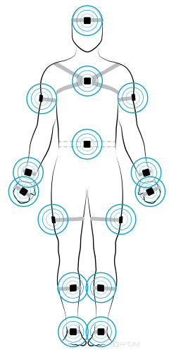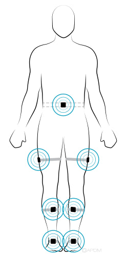 APDM enables full-body kinematic measurement, capturing a wide range of movements across the body. This includes neck flexion-extension, lateral bending, and rotation; back flexion-extension, lateral bending, and rotation; shoulder flexion-extension, abduction-adduction, and internal-external rotation; elbow flexion-extension and supination-pronation; wrist flexion-extension and ulnar-radial deviation; hip flexion-extension, abduction-adduction, and internal-external rotation; knee flexion-extension, varus-valgus, and internal-external rotation; and ankle dorsiflexion-plantarflexion, inversion-eversion, and abduction-adduction.