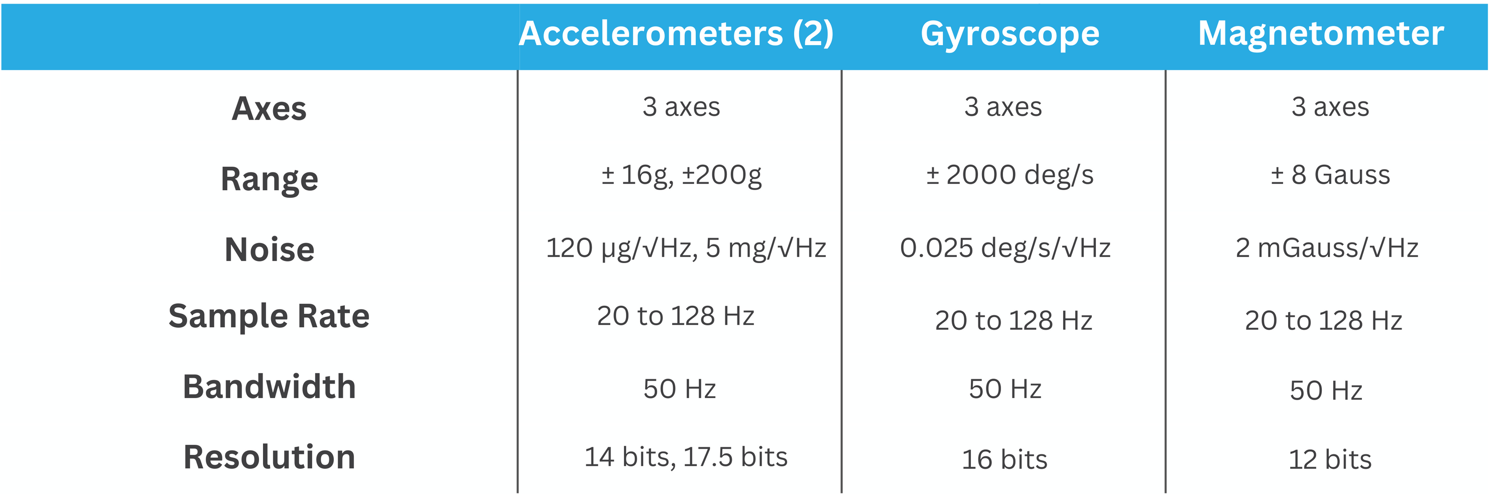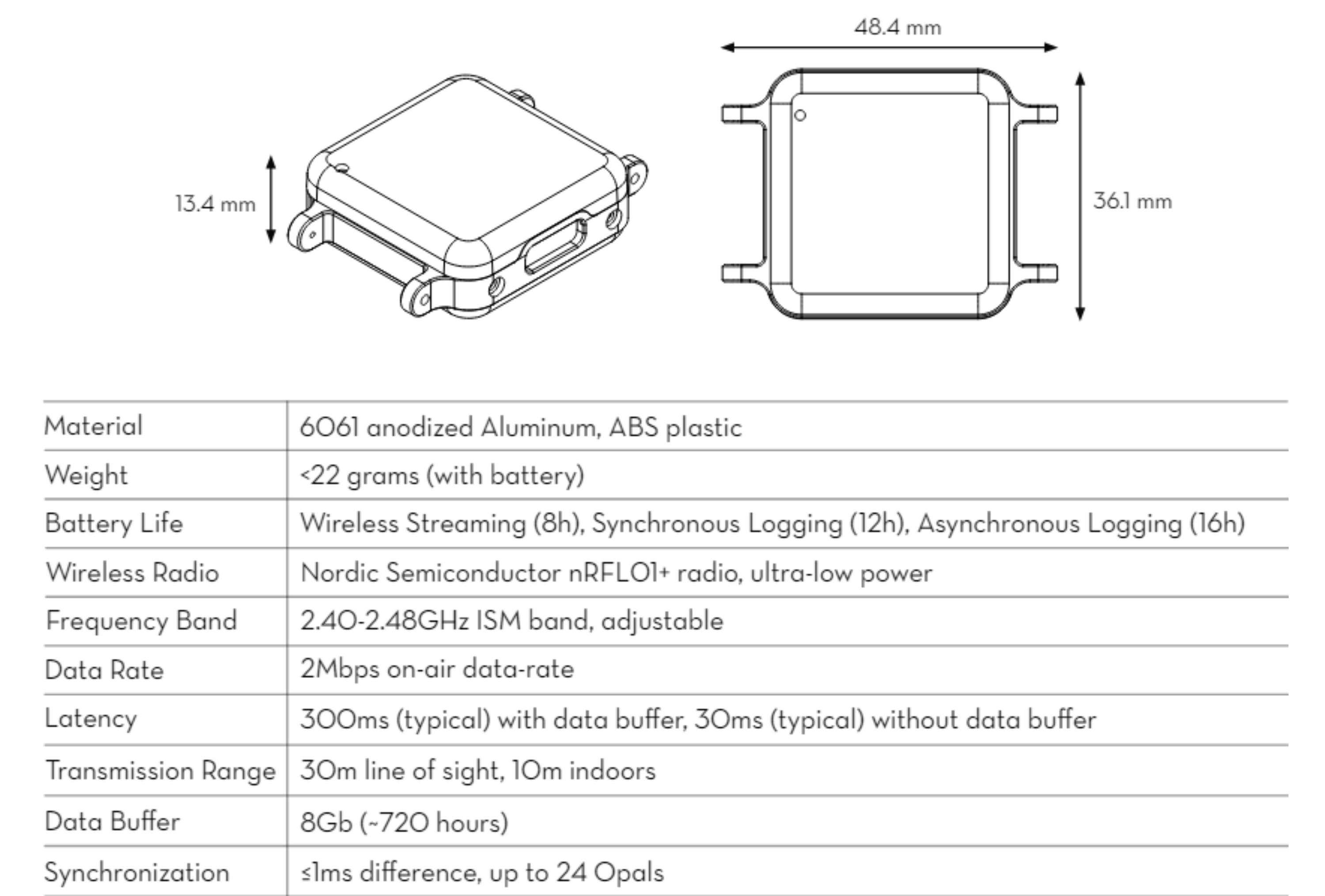 The APDM sensor offers high sampling and syncs with MATLAB, Java, Python, and C. It provides raw kinematic data, streams or logs data, and lasts 8hr-4d on a charge. With up to 24 Opals on one network.